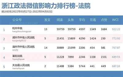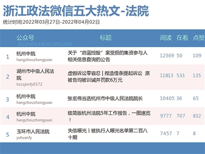 本期法院榜,“杭州中院”依旧稳居第一。为维护集资参与人的合法权益,做好及时有效清退案款的准备,“杭州中院”《关于“启蓝控股”案受损的集资参与人相关信息查询的公告》一文对相关信息进行告示,获广泛关注,居热文榜榜首。