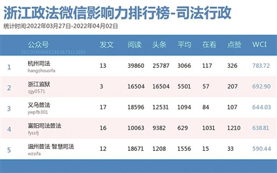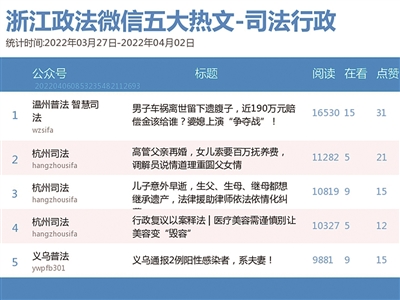 本期司法行政榜,前三名依次为“杭州司法”“浙江监狱”“义乌普法”。热文榜上,“温州普法 智慧司法”《男子车祸离世留下遗腹子,近190万元赔偿金该给谁?婆媳上演“争夺战”!》一文兼具故事性与法理性,锁定榜首。