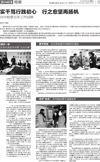 5年来,台州检察164个案件获评全国、全省精品案事例;基本养老保险领域公益诉讼专项监督工作入选法治浙江“重要窗口”实践100例、获评浙江省改革创新最佳实践案例;预防性检察公益诉讼机制获评全省有辨识度有影响力法治建设成果……这些年,台州检察的集体荣誉也不断,路桥检察院、市检察院第五检察部先后被最高检荣记集体一等功,温岭检察院获评全国先进基层检察院。