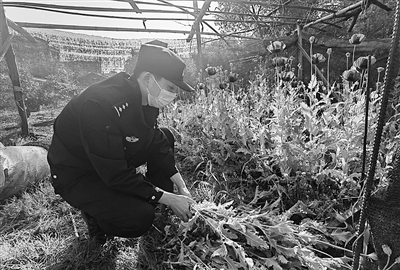 眼下正值罂粟开花结果时期,近日,台州市公安局路桥分局蓬街派出所深入开展禁种铲毒踏查工作,及时铲除非法种植的毒品原植物——罂粟。图为民警周如广正在铲除罂粟。通讯员 林静 摄