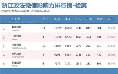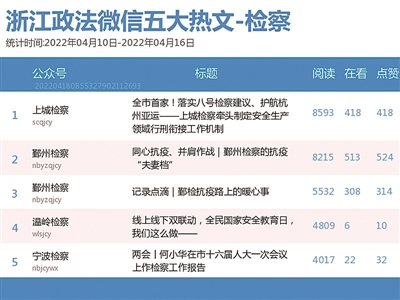 本期检察院榜,前三名依次为“鄞州检察”“上城检察”“杭州检察”。其中,“上城检察”的《全市首家!落实八号检察建议、护航杭州亚运——上城检察牵头制定安全生产领域行刑衔接工作机制》一文获得最多阅读量,该文关注企业安全生产溯源治理、护航杭州亚运,引人关注。