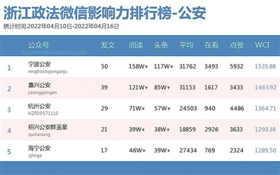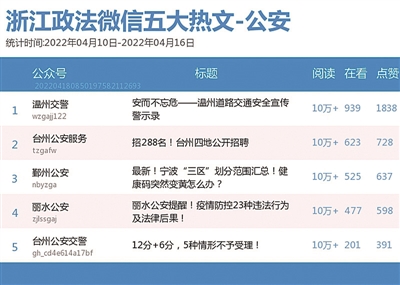 本期公安榜,“宁波公安”在激烈竞争中夺得榜一。“温州交警”的《安而不忘危——温州道路交通安全宣传警示录》一文获得10万+阅读量和1838点赞数,稳居热文榜首。该文借助真实事故案例,讲述道路交通安全知识,传播安全出行的重要性。