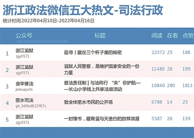 本期司法行政榜,“浙江监狱”重回榜首,成绩亮眼,且在前五的热文中,占有三篇。其中,《追寻|藏在三个杯子里的秘密》一文位居热文第一。“浙江监狱”透过三个普通的杯子,讲述了三代监狱人民警察对优良家风的传承和忠诚无声的誓言、矢志不渝的信念。