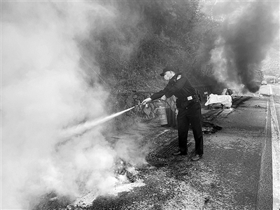 日前,溧宁高速溪口段北往南方向,一辆货车停靠在灵溪收费站出口路边,车上货物燃起熊熊大火。龙游公安、消防、应急救援等多部门迅速反应,十几分钟便将大火扑灭,恢复了高速公路正常通行。事故未造成人员伤亡。