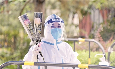 5月12日,在北京市朝阳区八里庄街道,一位参与核酸筛查工作的护士收到祝福的鲜花。