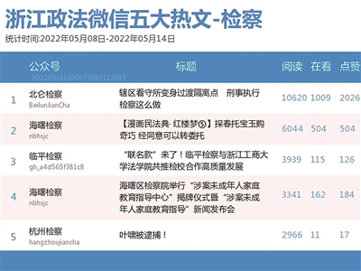 本期检察院榜的双料冠军是黑马“北仑检察”。该公众号热文《辖区看守所变身过渡隔离点 刑事执行检察这么做》收获了“10620”阅读数。宁波市北仑区看守所是宁波唯一的新收押人员集中过渡隔离点,北仑区人民检察院与该点共建联动工作机制,通过视频联席会议、视频巡查等方式重点监督新收押人员入所、监室隔离管控、隔离期满在押人员转押等工作,筑牢防护网。