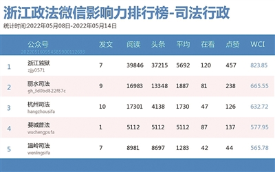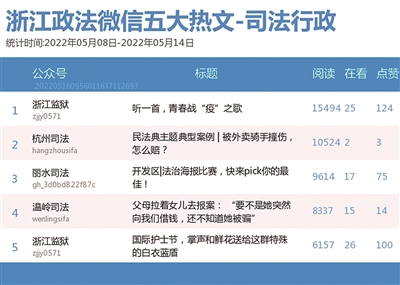 司法行政榜上,老将“浙江监狱”获得“双料冠军”。该公众号热文《听一首,青春战“疫”之歌》讲述了省长湖监狱一群青年民警的故事,他们自己上阵录歌、剪视频,全方位展示监狱民警坚守一方的奋斗身影。