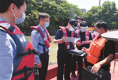 行至拱宸桥一带,执法人员随机登上一艘满载货物的“浙长兴×××”货船进行例行检查。经查,船上各项台账均符合规定。“运河上桥梁、来往船只较多,特别是会船时一定要保持专注,注意行船安全。”余杭港航执法队员谢康敏叮嘱船员。