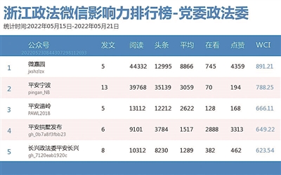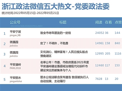 本期政法委榜上,老将“微嘉园”发挥稳定,以“4W+”阅读量夺得榜首。热文榜上,“平安宁波”推送的《致全市老年朋友的一封信》获得最高阅读量,此文目标明确,专门提醒老年人要保持头脑清醒、常存警戒心理、提高反诈意识。
