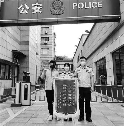 送锦旗的小伙子小明(化名)是一名IT男。小明说,最近民警怕他被电信网络诈骗,连续6天上门劝阻3次,每次劝阻都苦口婆心,为他操碎了心。他很是感动,于是专门写了两句诗做成锦旗,以示感谢。