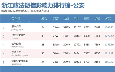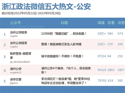 公安榜上,“嘉兴公安”“台州公安服务”“杭州公安”分获榜单前三。其中,“台州公安服务”的《12306的“隐藏功能”,赶快收藏!》和《警惕!猴痘病毒已发生人际传播》两篇文章分别以10万+的阅读量登上热文榜第一、二名。
