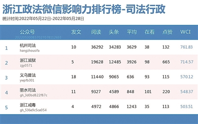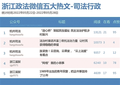 司法行政榜上,“杭州司法”再回榜首。“杭州司法”与“浙江监狱”共同瓜分热文榜前五,其中“杭州司法”的《“连心桥”架起民生福祉 民主法治护航乡村振兴》一文,拿下热文榜第一。