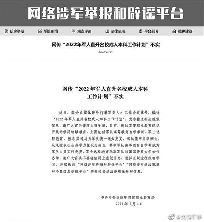 7月4日,中央军委训练管理部职业教育局发布提示:近日,部分自媒体账号打着军委人才工作会议旗号,编造“2022年军人直升名校成人本科工作计划”,发布推送招生虚假信息,请广大官兵谨防上当受骗。目前,通过军事职业教育组织开展的学历继续教育,报名渠道均为军队统一通知发文、部队集中组织招生,从未授权社会办学力量代为招生。