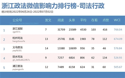 司法行政榜上,“浙江监狱”稳居榜首。热文榜上,榜一和榜二都被“杭州司法”斩获。值得一提的是,热文榜前十的文章,许多兼具故事性和趣味性,说明贴近民生才能更好地吸引读者。