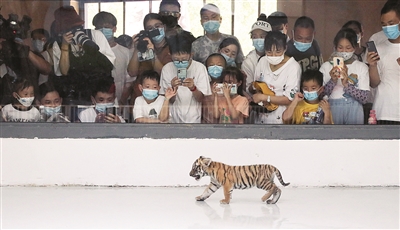 当日,中国华南虎苏州培育基地的一只雌性小华南虎首次与游客见面,萌态十足。这只小华南虎出生于2022年4月29日,目前生长情况良好。