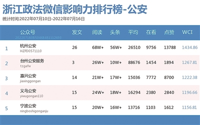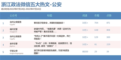 “杭州公安”以一周“68万+”的阅读量蝉联第一。热文榜榜首是来自“台州公安服务”的《事关孩子的安全,关键时刻能救命!》,该文为“防溺水”支招,恰逢其时,备受关注。