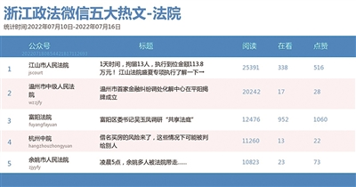 本期前三名依次为“温州市中级人民法院”“江山市人民法院”“杭州中院”。热文榜榜首是来自“江山市人民法院”的《1天时间,拘留13人,执行到位金额113.8万元! 江山法院盛夏专项执行了解一下→》,该文图文并茂地展示了江山法院“盛夏”专项执行活动的成效,赢得众多网友点赞。