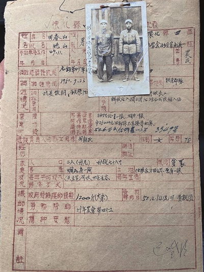 去年10月,正在旧书网淘食谱的他意外看到一张烈士登记表和一张照片。至此,一段被“折叠”的往事赫然在目:登记表上的那个名字叫田春山,籍贯写着“湖南省怀化县泸阳乡九农会五组富角溪”,1949年11月参军,1951年在抗美援朝战场上牺牲。照片上有两个人,其中一位可能是田春山。