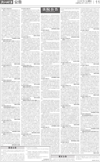 (2022)浙0726民初2518号 罗福求:本院受理原告郑平源与被告罗福求、胡金兰买卖合同纠纷一案,原告提出诉讼请求:1、判令由二被告立即归还原告货款10170元及逾期付款利息(以10170元为基数,从2022年5月19日起按同期全国银行间拆借中心公布的贷款市场报价利率计算至实际履行之日止);2、判令由二被告承担本案诉讼费用。因无法用其他方式向你送达,现依法向你公告送达起诉状副本、应诉通知书、举证通知书、证据材料和开庭传票。自本公告发出之日起,经过三十日即视为送达。提出答辩状的期限为公告送达期满后的15日内。举证期限为公告送达期满后的15日内。本案由胡红建担任审判员独任审理,定于2022年9月19日9时0分在浦江县人民法院杭坪法庭3号庭公开开庭进行审理。逾期未到庭应诉,本院将依法缺席裁判。浦江县人民法院(2022)浙0726民初1302号 柳钧耀:本院受理原告李日龙诉你买卖合同纠纷一案,已审理终结,现依法向你公告送达(2022)浙0726民初1302号判决书。判决如下:一、被告柳钧耀于本判决生效之日起十日内支付原告李日龙货款248960元并支付逾期付款违约金(自2022年1月1日起按月利率1%计算至实际清偿之日止);二、驳回原告李日龙的其他诉讼请求。如果未按本判决指定的期间履行给付金钱义务,应当依照《中华人民共和国民事诉讼法》第二百六十条之规定,加倍支付迟延履行期间的债务利息。案件受理费2518元(减半收取),由被告柳钧耀负担。自公告之日起30日内来本院领取民事判决书,逾期即视为送达。如不服本判决,可在公告期满后15日内,向本院递交上诉状及副本,上诉于浙江省金华市中级人民法院。逾期本判决即发生法律效力。浦江县人民法院(2022)浙0802民初2790号 尹俊新:本院受理原告颜建梅诉你民间借贷纠纷一案,因以其他方式无法向你送达相关法律文书,现依法向你公告送达(2022)浙0802民初2790号案件的起诉状副本及证据材料、应诉与举证通知书、开庭传票、廉政监督卡、风险提示卡、合议庭组成人员通知书等。原告诉请要求你偿还借款人民币283000元,并承担本案诉讼费用。自公告之日起经过30日即视为送达。提出答辩状和举证的期限分别为公告送达期满后的15日内和30日内。并定于举证期满后的第3日(遇节假日顺延)9时15分在本院智造新城人民法庭第四法庭公开开庭审理,逾期将依法缺席审理。衢州市柯城区人民法院(2022)浙0781破25号 债务人浙江天梭织业有限公司破产清算一案,本院已于2022年6月23日依法裁定受理,现特就有关事项公告如下:一、债权人应自2022年7月22至2022年8月22日前向管理人申报债权,对债权数额和有无财产担保等情况,应提交有关证明材料。逾期未申报的,可以在破产财产最后分配日前补充申报,但此前已进行的分配,不再补充分配,为审查和确认补充申报债权的费用,由补充申报人承担。二、对浙江天梭织业有限公司的其他执行程序依法中止执行,申请执行人可凭生效的法律文书向管理人申报债权。有关浙江天梭织业有限公司的民事诉讼或仲裁程序也应依法中止,在管理人接管债务人的财产后,该诉讼或仲裁继续进行。三、本院指定浙江大名律师事务所为浙江天梭织业有限公司管理人,并已制定民事裁定书交付给管理人。债权申报时间和地点为2022年7月22日至2022年8月22日在兰溪市中洲路57号二楼浙江大名律师事务所,联系人为刘晓华,联系电话:13706895129。四、债务人或财产持有人应自本院裁定受理破产申请之日起,向本院指定的管理人清偿债务或交付财产。债务人的债务人或财产持有人故意向债务人清偿债务或交付财产,使债权人遭受损失的,不免除其清偿债务或交付财产自义务。五、本院定于2022年8月25日上午9时在兰溪市人民法院第七审判庭(兰溪市横山路58号)召开第一次债权人会议。兰溪市人民法院(2022)浙0781破26号 债务人浙江东润针织有限公司破产清算一案,本院已于2022年6月23日依法裁定受理,现特就有关事项公告如下:一、债权人应自2022年7月22至2022年8月22日前向管理人申报债权,对债权数额和有无财产担保等情况,应提交有关证明材料。逾期未申报的,可以在破产财产最后分配日前补充申报,但此前已进行的分配,不再补充分配,为审查和确认补充申报债权的费用,由补充申报人承担。二、对浙江东润针织有限公司的其他执行程序依法中止执行,申请执行人可凭生效的法律文书向管理人申报债权。有关浙江东润针织有限公司的民事诉讼或仲裁程序也应依法中止,在管理人接管债务人的财产后,该诉讼或仲裁继续进行。三、本院指定浙江大名律师事务所为浙江东润针织有限公司管理人,并已制定民事裁定书交付给管理人。债权申报时间和地点为2022年7月22日至2022年8月22日在兰溪市中洲路57号二楼浙江大名律师事务所,联系人为刘晓华,联系电话:13706895129。四、债务人的债务人或财产持有人应自本院裁定受理破产申请之日起,向本院指定的管理人清偿债务或交付财产。债务人的债务人或财产持有人故意向债务人清偿债务或交付财产,使债权人遭受损失的,不免除其清偿债务或交付财产自义务。五、本院定于2022年8月25日上午9时30分在兰溪市人民法院第七审判庭(兰溪市横山路58号)召开第一次债权人会议。兰溪市人民法院(2019)浙0781强清1号 本院于2019年10月24日裁定受理对浙江锦虎纺织有限公司强制清算一案,并于2019年11月7