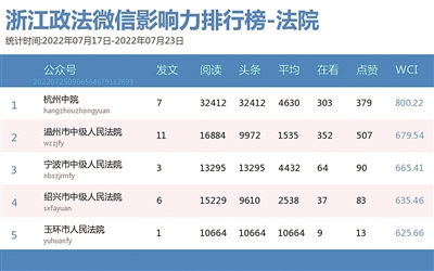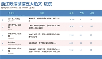 本期法院榜,“杭州中院”重新冲回榜首。热文榜第一则是来自“玉环市人民法院”的《失信曝光│被执行人曝光名单第二百九十三期》一文。打击失信被执行人,一直在路上!
