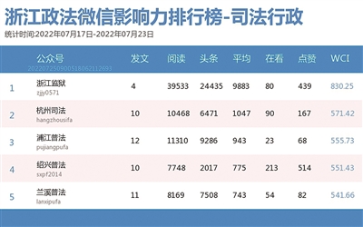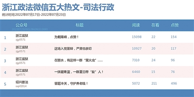 本期司法行政榜,“浙江监狱”又双叒是榜首。前五热文中,4篇来自“浙江监狱”。其中《为戴雍峰,点赞!》一文讲述了省金华监狱四监区辅警戴雍峰勇救溺水儿童的事迹,一起为见义勇为者点赞!