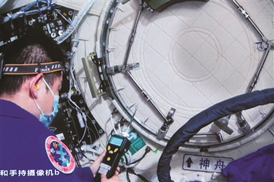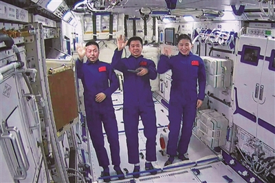 | 航天员陈冬(中)、刘洋(右)、蔡旭哲进入问天实验舱。 |