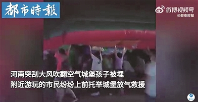 大风吹翻空气城堡 众人托举救人