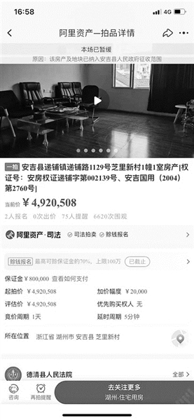 然而,就在房产开拍前两日,德清法院执行局接到安吉县一拆迁指挥部电话,告知余某名下的这处房产已签署了房屋征收补偿安置协议,房产货币征收补偿金额达707万余元。执行人员立即赶往安吉,核实确认。