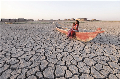 7月24日,在伊拉克济加尔省一处干涸的湿地,孩子们坐在船上。