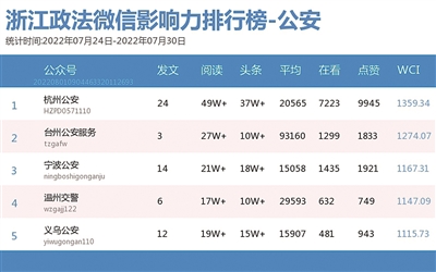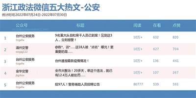 本期公安榜上,整体发挥稳定,共产出4篇“10W+”好文。“杭州公安”和“台州公安服务”角逐激烈,“杭州公安”坐上影响力榜头把交椅,“台州公安服务”则包揽了热文榜第一、第三和第五。