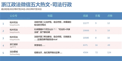 本期司法行政榜上,“杭州司法”凭借傲人的成绩当之无愧夺得头名,排在第二、第三位的是“浙江监狱”和“义乌普法”。热文榜上,“杭州司法”的《法助共富 | 以法护航、助企纾困,来看富阳给出的方程式》一文,展示了富阳区司法局在优化营商环境、激发市场活力等方面实施的“硬核”举措,获得众人点赞。