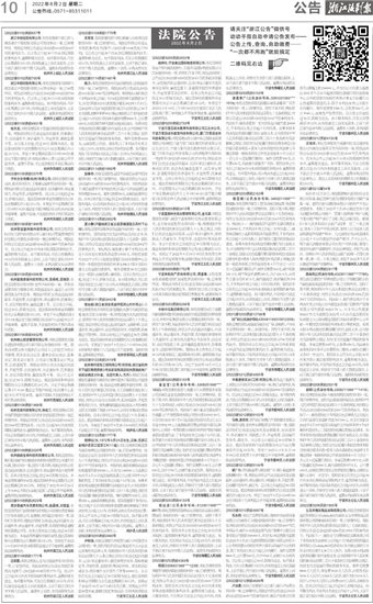 (2022)浙0108民初3320号 杭州皓韵生物科技有限责任公司:本院受理原告陈行彪诉被告杭州皓韵生物科技有限责任公司著作权权属、侵权纠纷一案,因你下落不明,现依法向你公告送达起诉状副本、应诉通知书、举证通知书及开庭传票等。自本公告发出之日起,经过30日即视为送达。本案适用普通程序审理,提出答辩状和举证期限为公告送达期满后的15日内。本院定于2022年09月26日上午9:00在本院白马湖法庭第二法庭公开开庭审理,逾期将依法缺席判决。杭州市滨江区人民法院(2022)浙0108民初2629号 西安泰威汽车贸易有限公司、赵景刚、刘雪盈:本院受理原告仟金顶网络科技有限公司诉被告西安泰威汽车贸易有限公司、赵景刚、刘雪盈合同纠纷一案,因你们下落不明,现依法向你们公告送达起诉状副本、应诉通知书、举证通知书、开庭传票、简易程序转普通程序民事裁定书等。自本公告发出之日起,经过30日即视为送达。本案适用普通程序独任审理,提出答辩状和举证期限为公告期满后的15日内。本院定于2022年9月28日9时在本院第四法庭公开开庭审理,逾期将依法缺席判决。杭州市滨江区人民法院(2022)浙0108民初1771号 汪丽霞:本院受理张心志与汪丽霞劳务合同纠纷一案,已审理终结。现依法向你公告送达本院民事判决书[案号:(2022)浙0108民初1771号]。自公告之日起30日内来本院领取民事判决书,逾期则视为送达。如不服本判决,可在公告期满后15日内,向本院浦沿法庭递交上诉状及副本,上诉于浙江省杭州市中级人民法院。逾期未上诉的,本判决即发生法律效力。杭州市滨江区人民法院