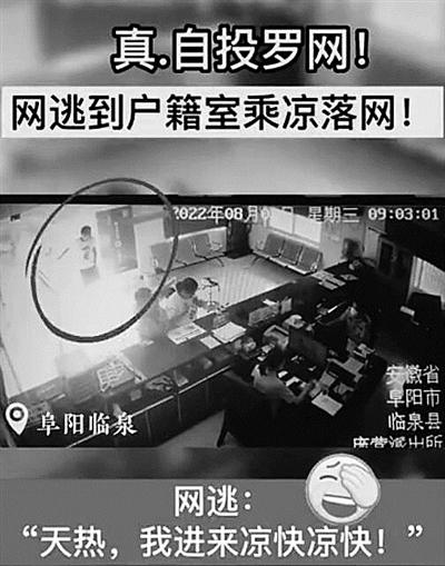 8月3日,安徽阜阳,一名男子走进派出所户籍室乘凉。民警感觉男子十分面熟,拍下照片仔细端详,确认其正是同事们找了两天不见踪影的网上在逃人员苏某,立即通知同事将其控制。