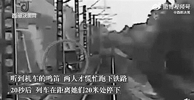 近日,广西钦州。57003次列车运行时,司机发现铁路上有两名女子,当即紧急制动停车并鸣笛。两人慌忙跑下铁路。20秒后,列车在距离她们20米处停下。据调查,两人均为初中生,当时正在铁路上拍照,共计造成两趟列车防撞停车。钦州港派出所分别对她们处以罚款100元的行政处罚并作批评教育。