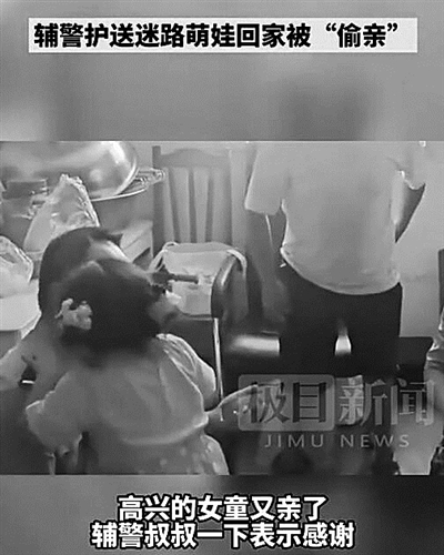 迷路女童被送回家后亲辅警脸颊