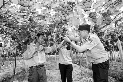 近日,台州市公安局黄岩分局城北派出所民警来到辖区内的葡萄园,帮忙采摘葡萄,并向果农了解治安动态,宣传反诈防骗知识,守护群众的“钱袋子”。