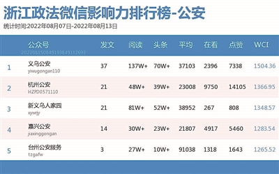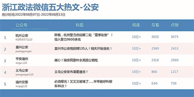 本期公安榜可谓是“高手过招”,激烈竞争中,“义乌公安”夺得榜首,总阅读量达137W+。而在热文榜中,10条上榜的推文均达到10万+的阅读量。从警方开展夏季攻势到曝光占道停车,读者对警方各项工作都非常关注。