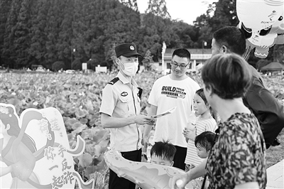 连日来,龙游县公安局民警在“荷花节”现场设置“打卡点”,向群众讲解反诈、防溺水等知识,掀起“百日行动”宣传攻势。通讯员 楼苑 摄