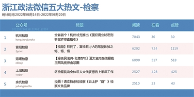 本期检察院榜,“杭州检察”稳居两榜第一,其《全省首个!杭州检方推出<侵犯商业秘密刑事案件审查指引>》一文,介绍了杭州市滨江区人民检察院结合办案实践,出台全省首个《侵犯商业秘密刑事案件审查指引》,为这类案件的审查提供了较为全面、系统的规则。
