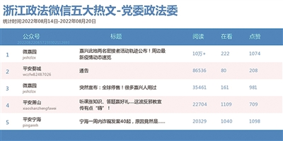 本期政法委榜上,“微嘉园”蝉联冠军宝座,其《嘉兴此地两名密接者活动轨迹公布!周边最新疫情动态速览》一文以10万+的阅读量居热文榜第一。