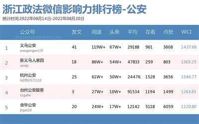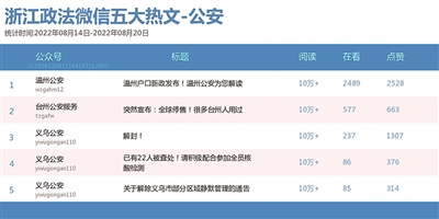 本期公安榜前三名由“义乌公安”“新义乌人家园”“杭州公安”获得。本期热文榜前十均为10万+好文,其中,“义乌公安”表现不俗,共有6篇热文登上榜单。