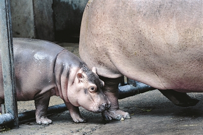 8月25日,在上海动物园,小河马依偎在妈妈身边。