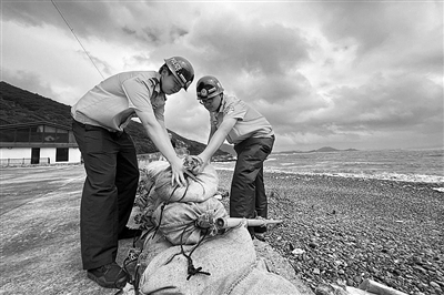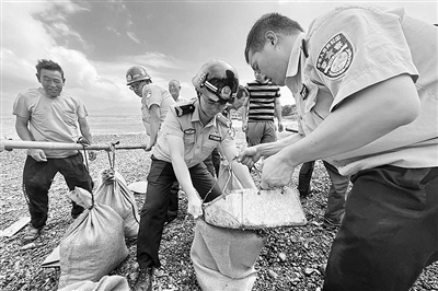 | ▲舟山市公安局普陀区分局桃花派出所民辅警协助村民装石子、扛沙袋,筑牢乌石子滩下海口防线 |