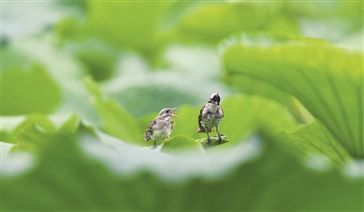 近日,在山东省滕州市荆河公园,两只小鸟落在荷叶上小憩。