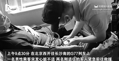 近日,从北京出发的G77次列车上,3号车厢一名乘客突发不适,列车长通过广播寻求医护人员。两名刚踏上返乡列车的退伍军人王健和周杰得知后,仅用57秒就从14车厢赶到患者所在的3车厢施救,在他们和列车乘务员的共同努力下,患者最终转危为安。