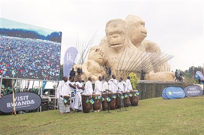 | 演员在山地大猩猩命名仪式现场表演传统鼓乐。 |