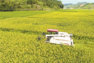 9月5日,淳安县汾口镇稻立方基地内,收割机在“巨型稻”间来回穿梭,饱满圆润的稻谷从出粮口喷涌而出,农民露出了笑颜。今年年初,千岛湖谷香园农业有限公司在汾口镇流转了近1000亩土地,其中300余亩用于种植“巨型稻”,现已进入收割期。