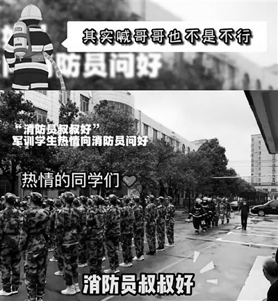 近日,河南漯河,正在军训的学生偶遇一群消防员,大家纷纷热情高喊消防员叔叔好,嗓门震天,让消防员都不好意思了。