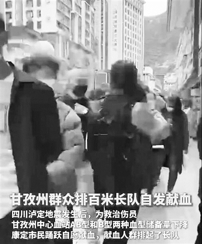 四川泸定地震发生后,为救治伤员,甘孜州中心血站AB型和B型两种血型储备量下降。康定市民踊跃志愿献血,献血人群排起了百米长队。