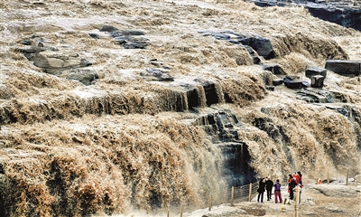 9月15日,游人在黄河壶口瀑布群前拍照、游览。